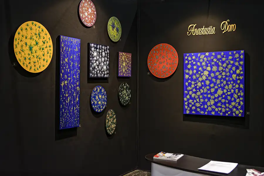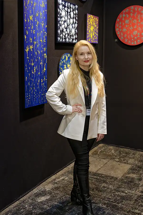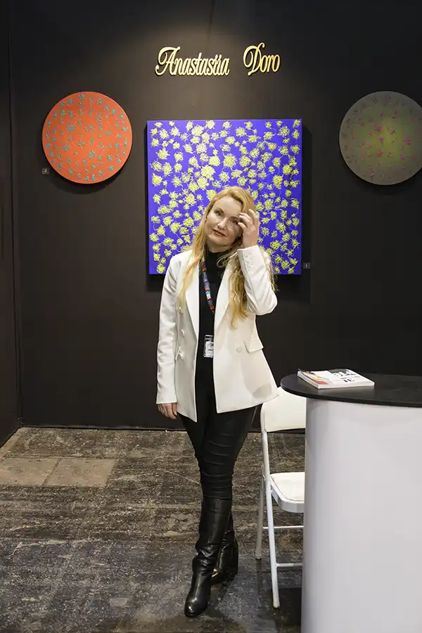 Anastasiia Doro, une artiste abstraite, nous venant d’Odessa en Ukraine, mais Parisienne depuis quelques années était, elle aussi présente pour nous présenter ses œuvres du moment.
